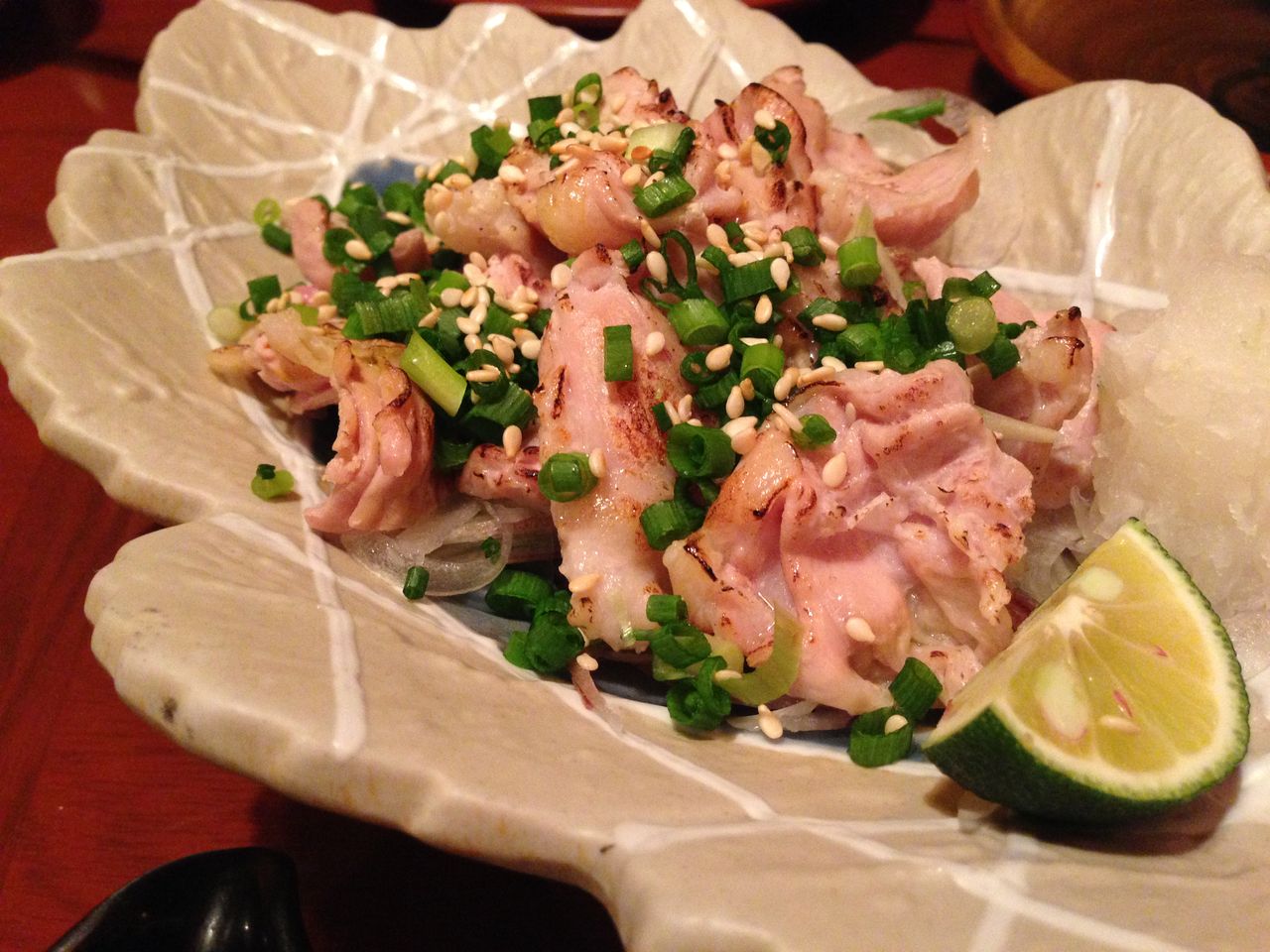 これは鶏のタタキだったかな。すだちをかけていただきます。
