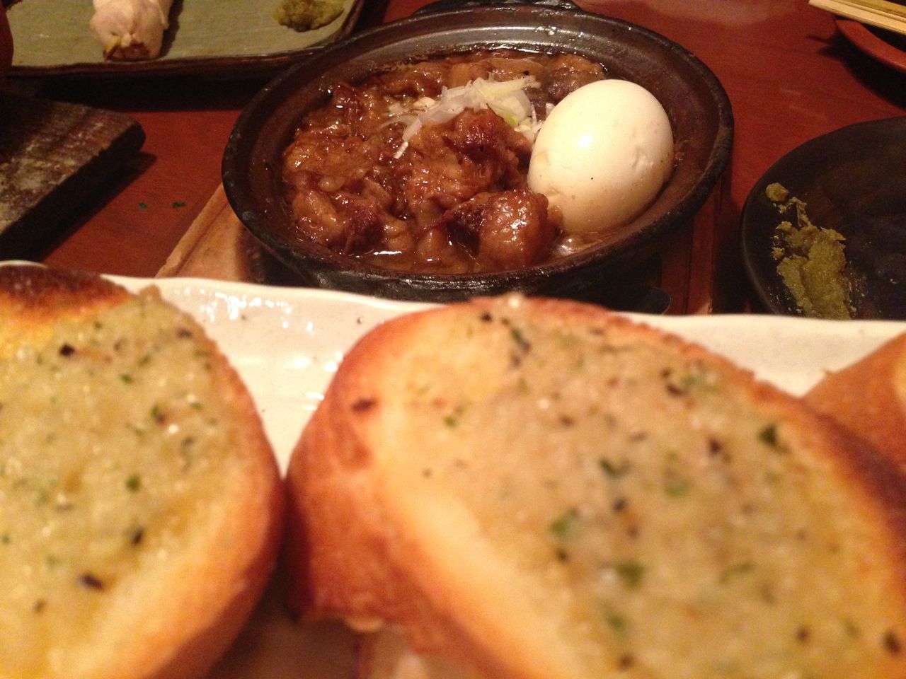 ガーリックトーストもつけられるので、ここに乗せて口に運ぶといいでしょう。とてもよくあいます。