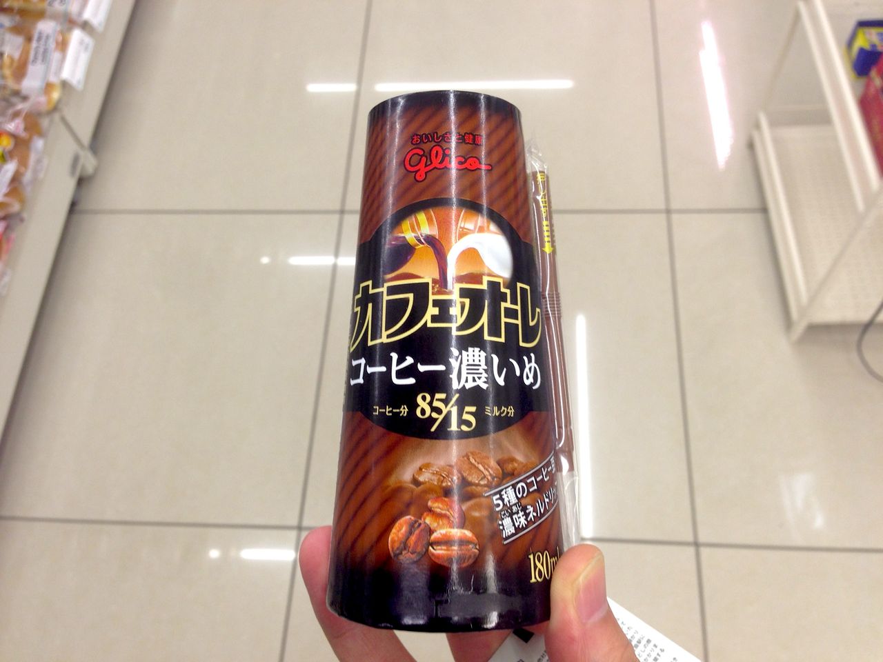 食後は相変わらずセブン-イレブンの挽きたてのコーヒーです。でも、ちょっと脳が疲れたなー、目の奥が痛いなーというときにはグリコの「カフェオーレ 85%」がいいですね。