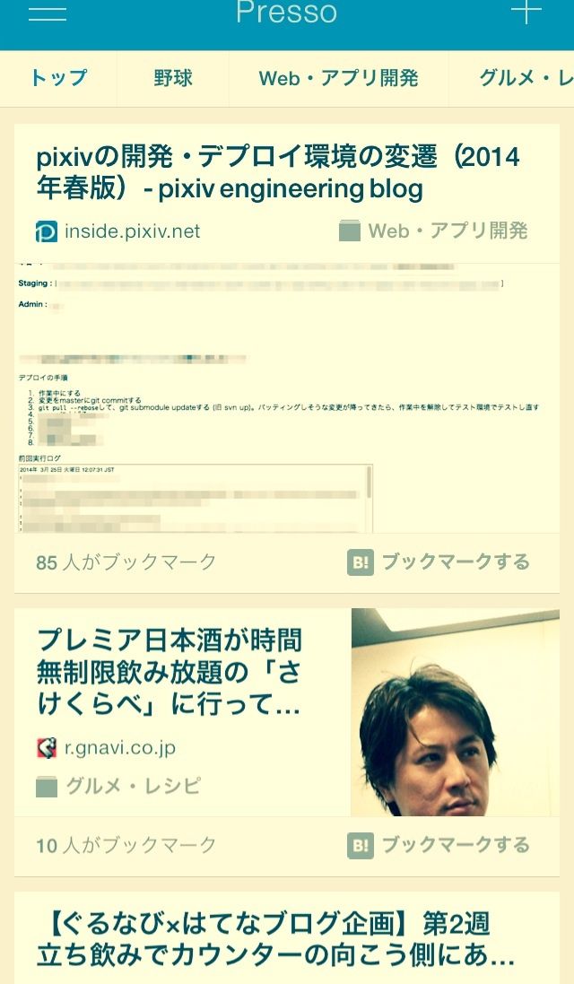というわけでPressoというアプリは、はてブのカテゴリを細分化し、タブで見せることによって、SmartNewsやGunosyのような体裁で人気記事をしっかりとオススメできるようになっています。