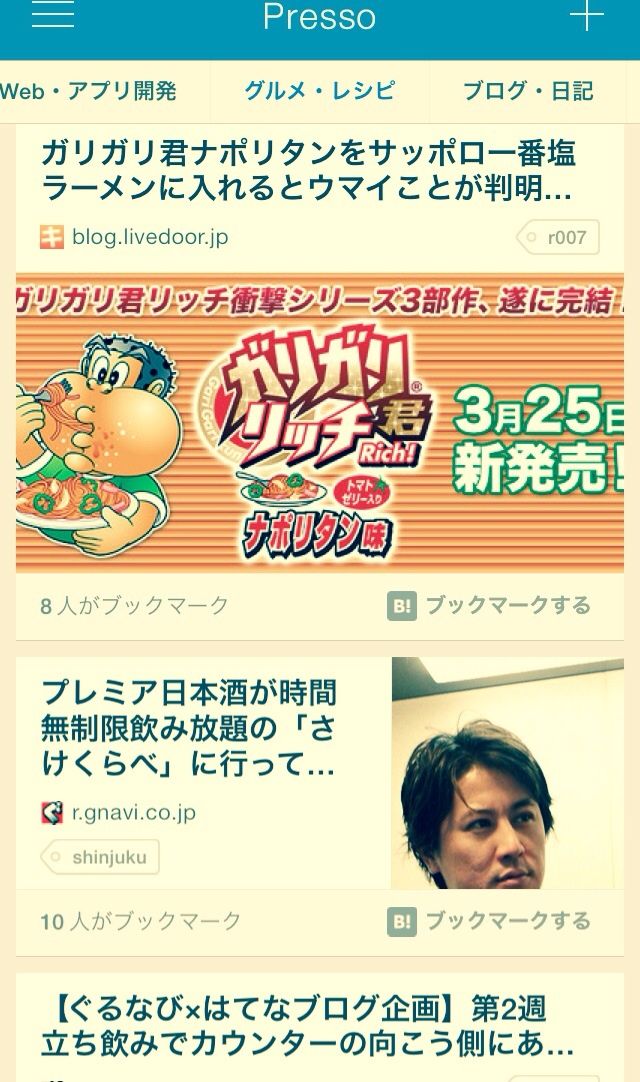 そして大事なのがプッシュ通知。上記の「今日の注目」を一日数回、スマホにプッシュ通知してきます。以前はよくGunosyで配信される記事ははてブで人気になった記事とかぶりすぎてるなんて言われていましたが、はてブを元に作られたニュースアプリであるPressoがプッシュを始めたら、Gunosyにとっては脅威だったりするかもしれませんね。