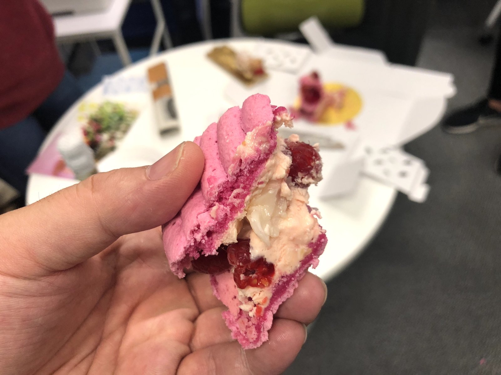 ざっくり言うと巨大なマカロンをふたつに切って、あいだにこれでもかと大量のベリーを挟んでいるようです。生で見るとかなりおしゃれスイーツです。