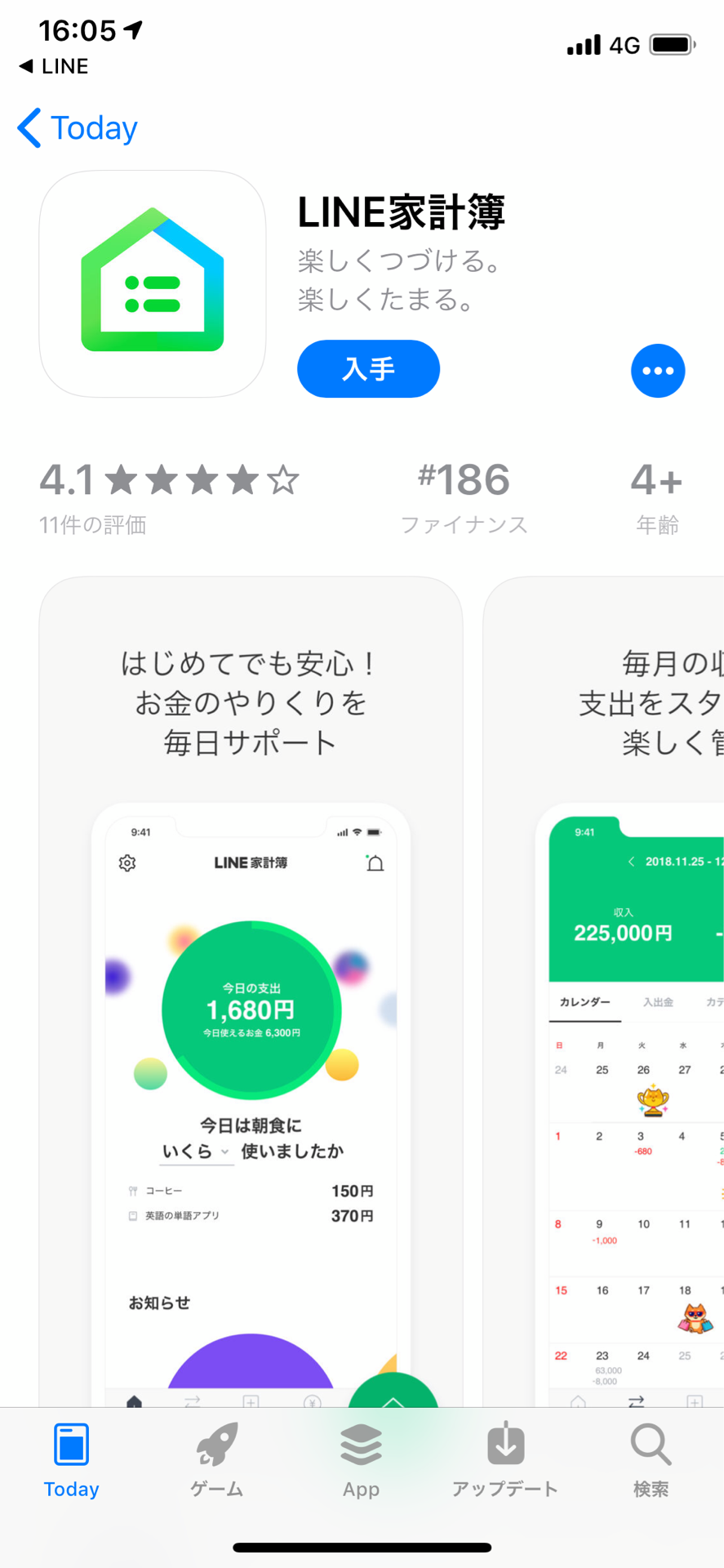 レポートのタブにいったら、アプリをダウンロードしろって言われて、App Storeに飛ばされる。LINEアプリ内で完結するわけではなく、別アプリもあるのか。