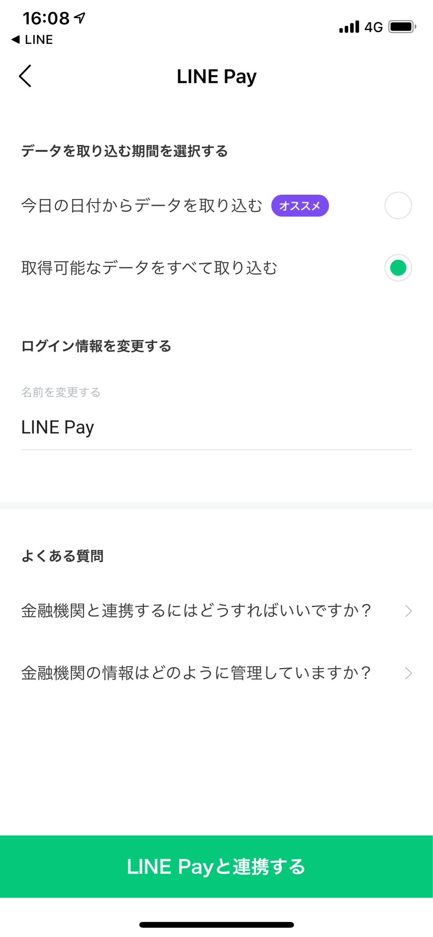 連携画面はこんな感じ。一番上に手持ちの現金があって、次にLINE Pay。いいぞ。LINE Payユーザーとしてほっとした。