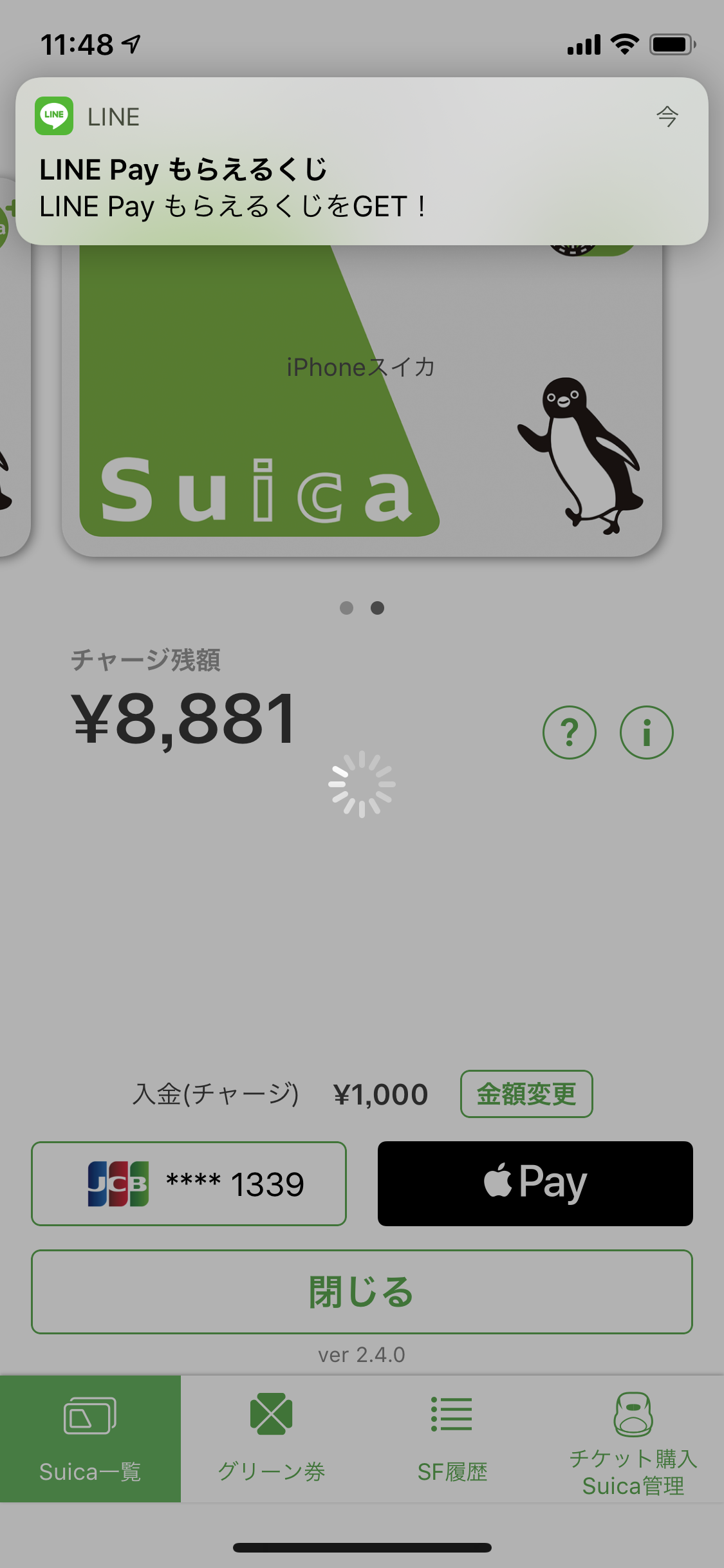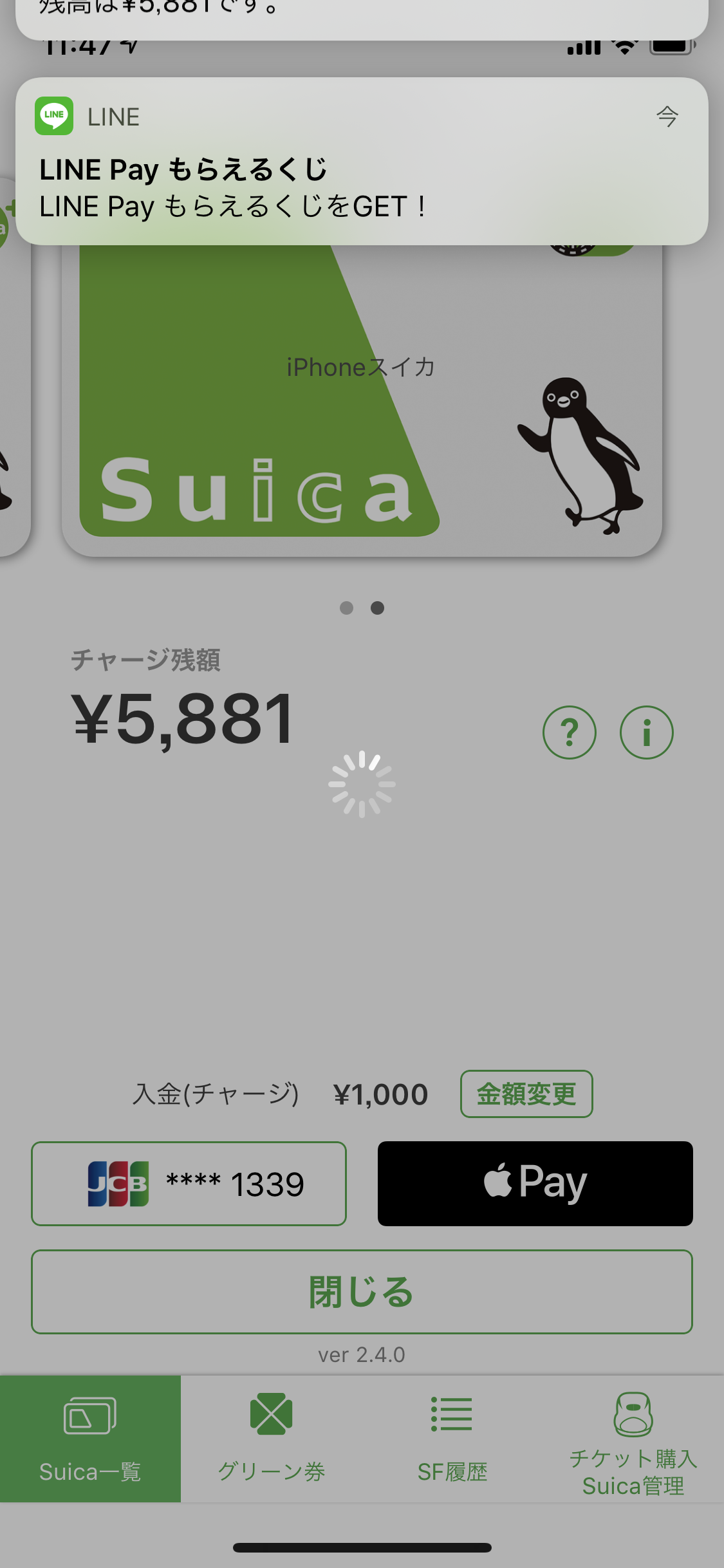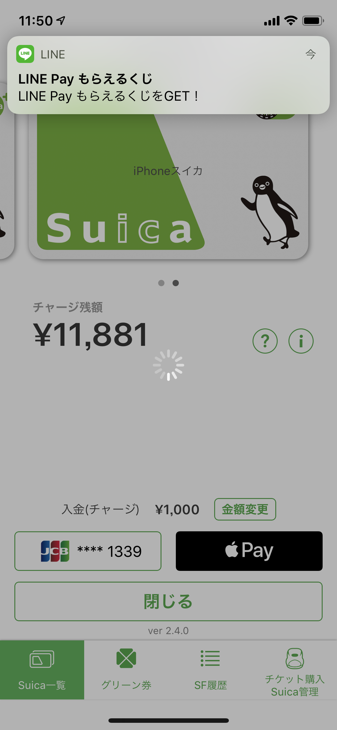 僕は普段SUICAにLINE Payカード経由でチャージしてるわけですが、これも立派なLINE Pay決済として処理されます。なのでいつもは1万円ずつチャージしてるところを、今日は1000円単位でちびちびとたくさんチャージして、そのたびにLINE Pay もらえるくじを引いちゃうぞというのが今回のチャレンジです。