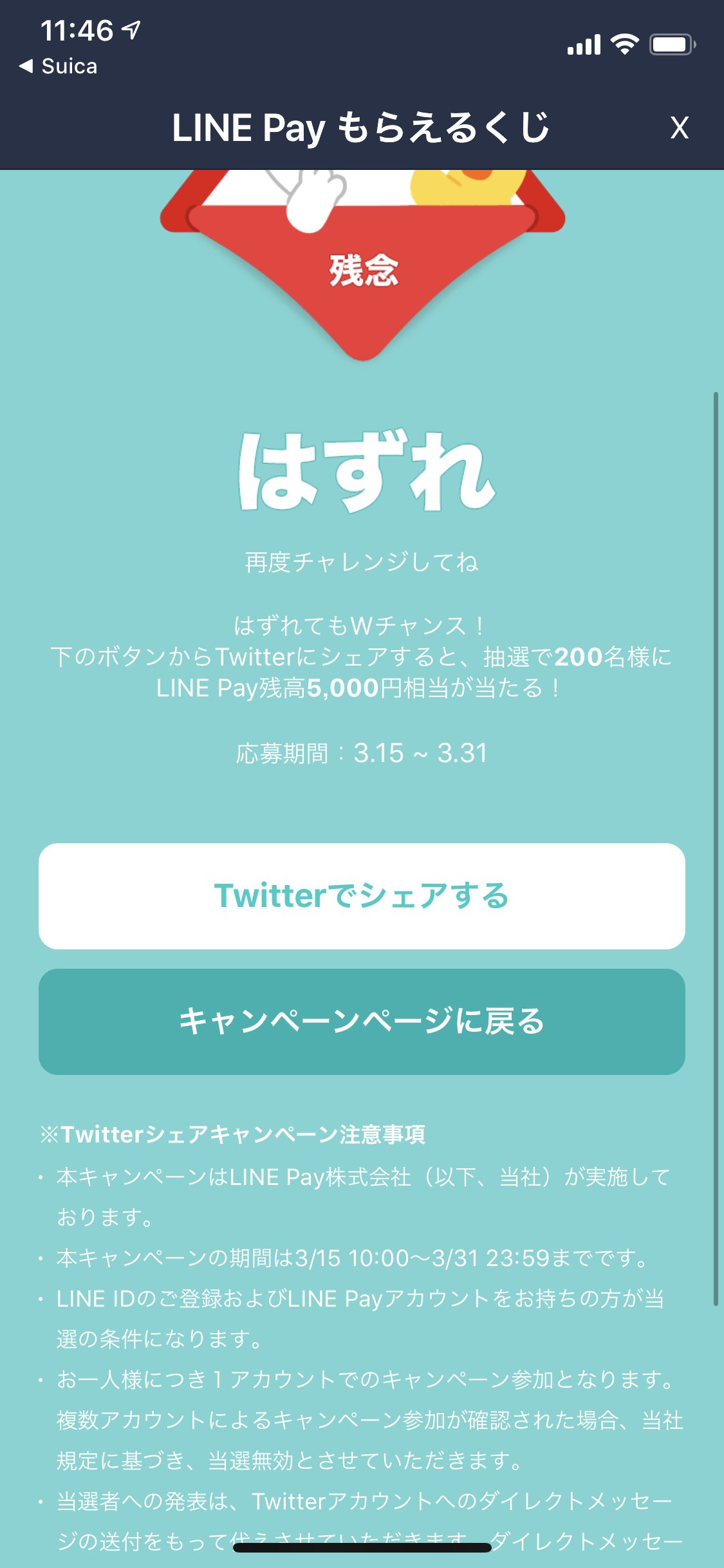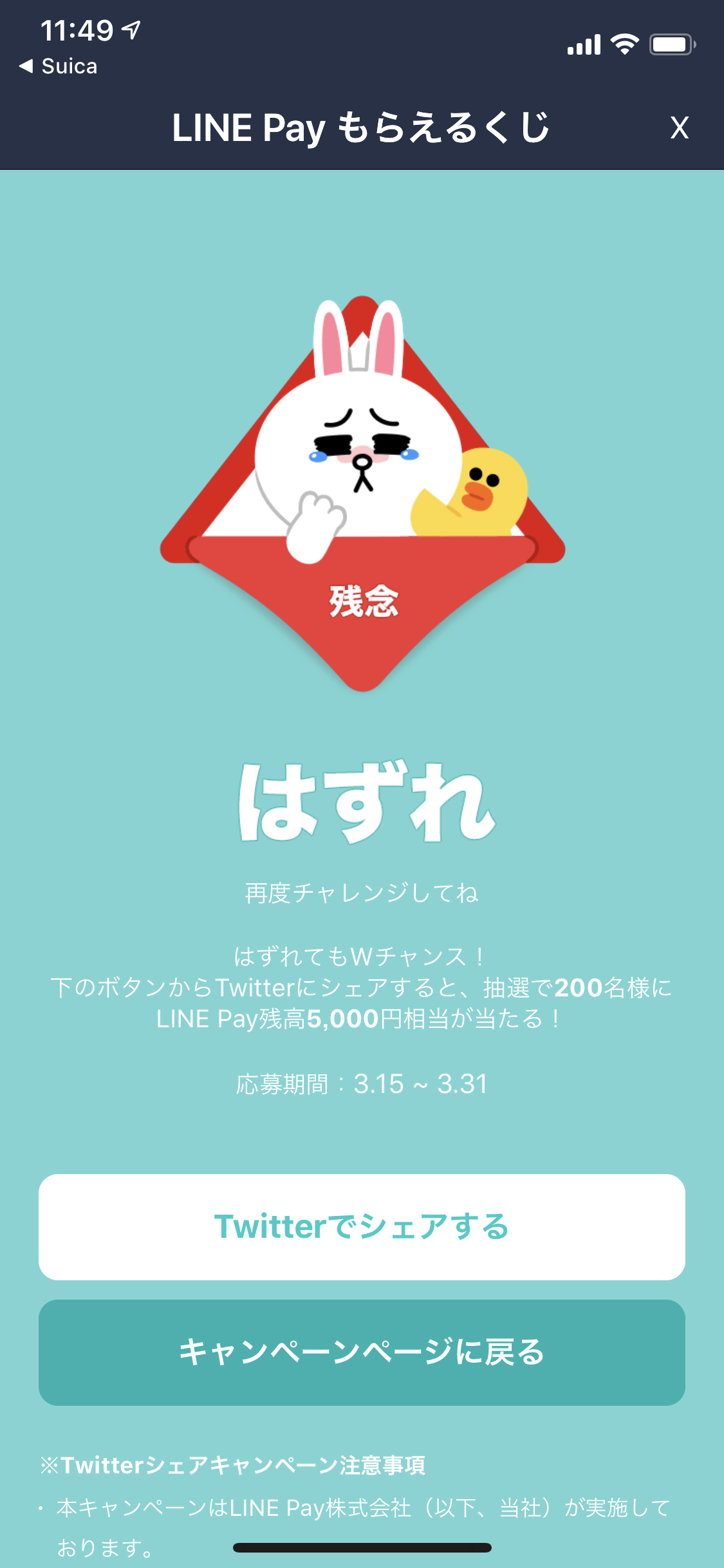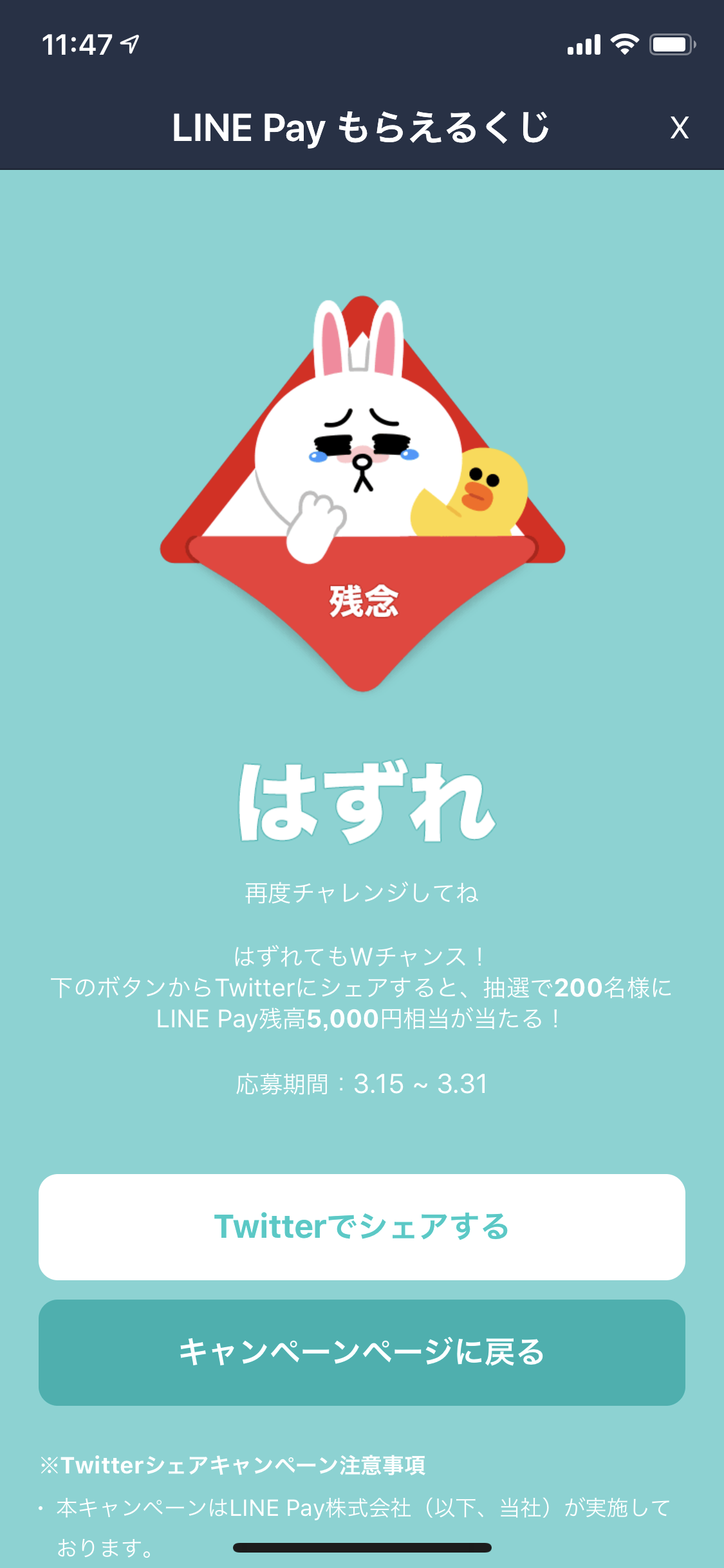 もはや「もういちいちLINEに通知してこなくていいよ、どうせ当たらないんだから」という気分なのですが、このくじ引きは今日3月31日が最終日。よーし1回くらい当てて終わるかということでLINE Payで無理やり決済してみたいと思います。