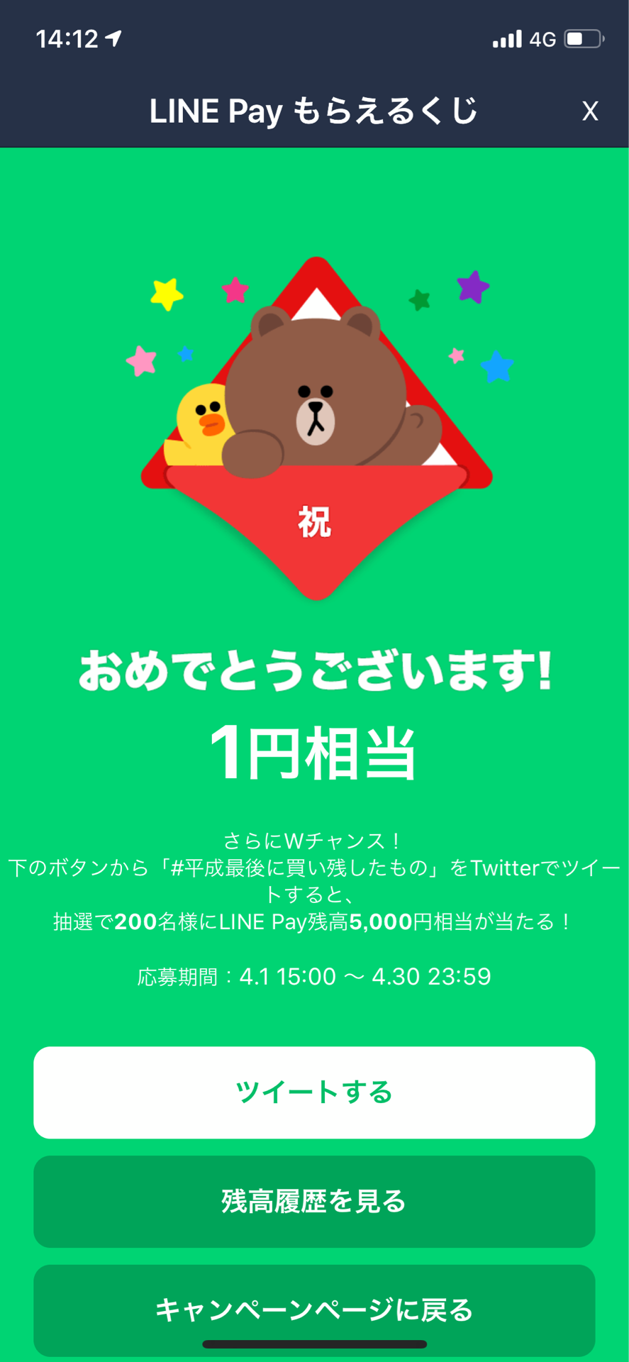 「LINE Payもらえるくじは当たる」と。
