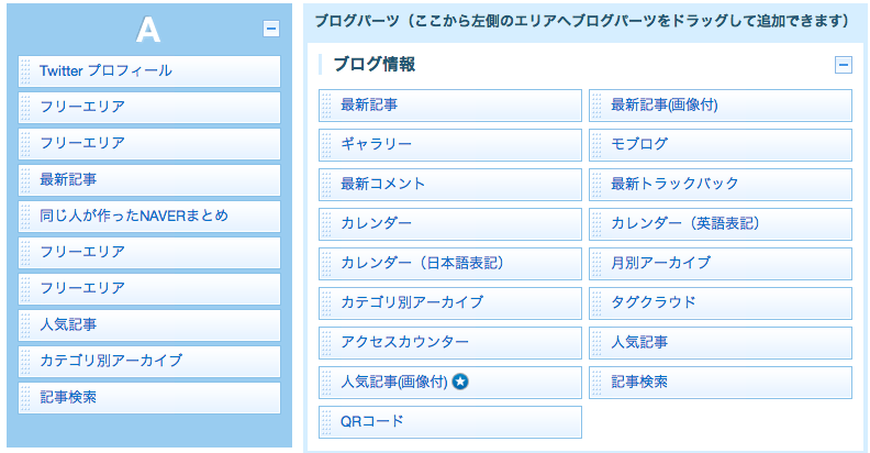 左の[A]のところに収まっているのが現在、narumi.blog.jp に表示されているブログパーツです。フリーエリアは何でも好きなものを入れられるボックスで、僕はGoogle AdSenseやFacebookのプラグインなどを放り込んであります。